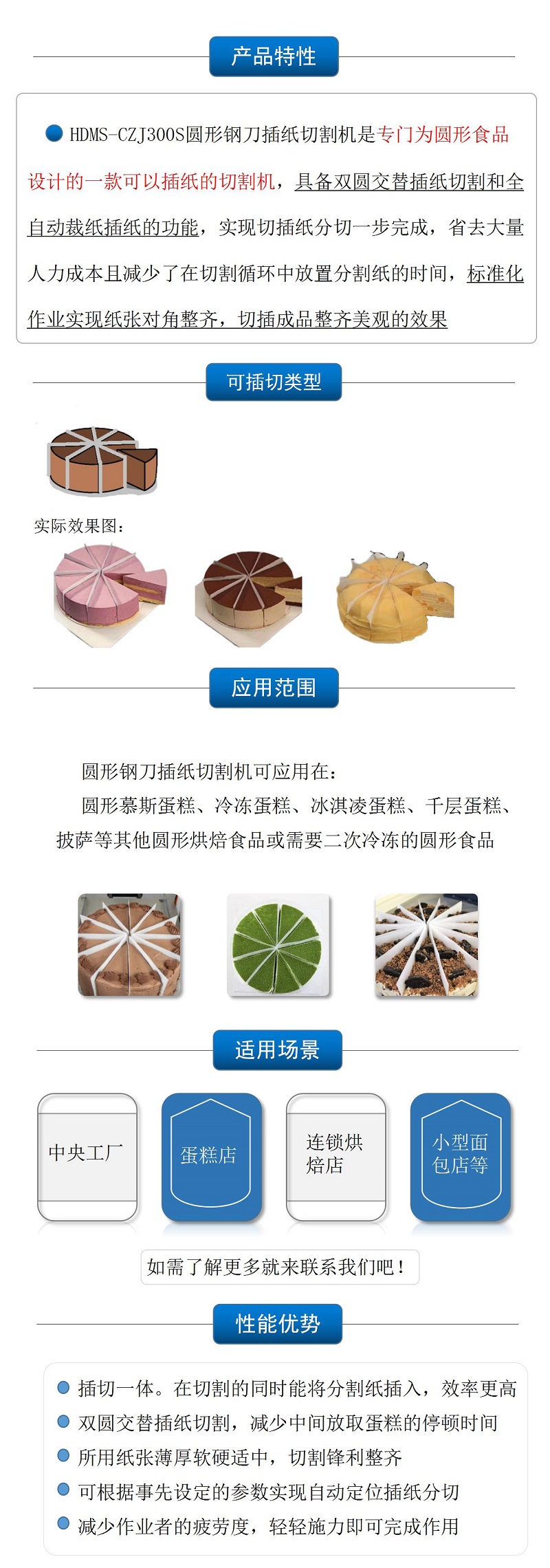 該設(shè)備利用超聲波高頻振動(dòng)切割,可以雙圓交替插紙分切,減少了中間因放取食物而造成的停機(jī)時(shí)間,效率高,產(chǎn)量更大 |